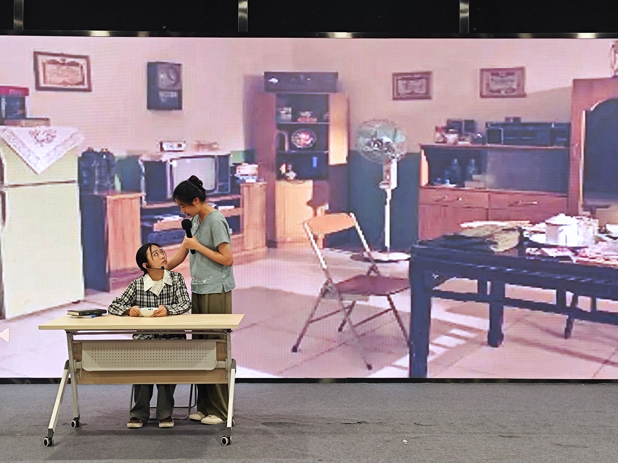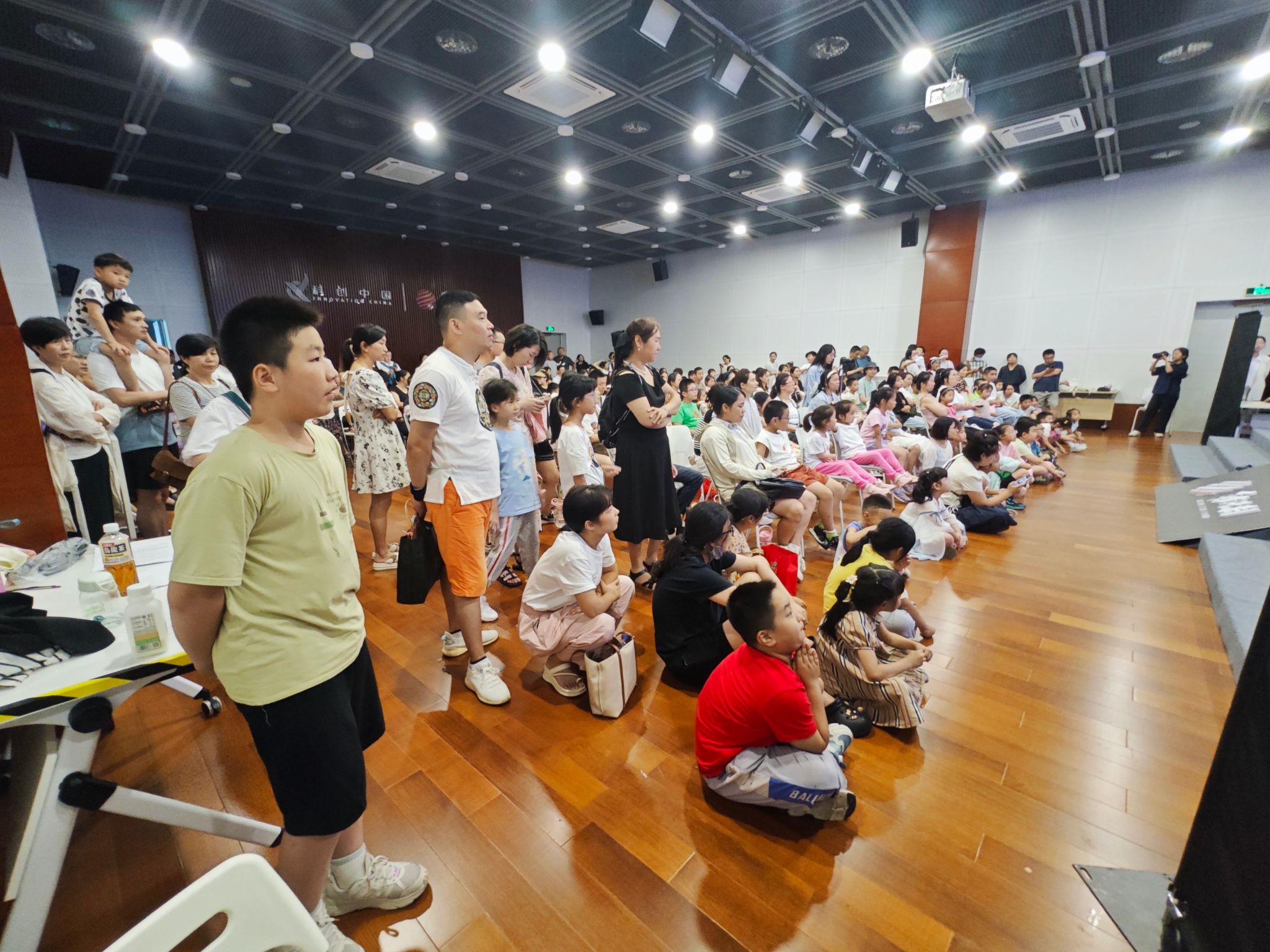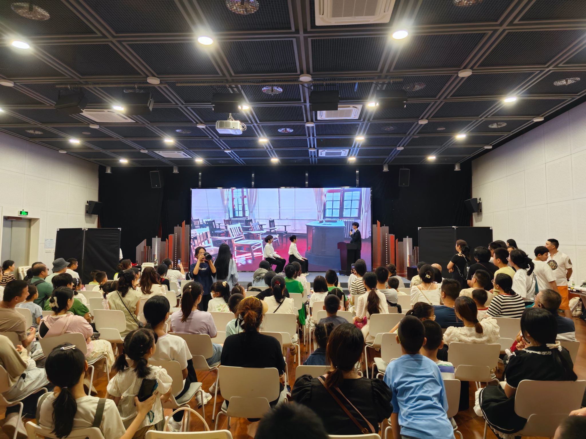由于是周日,宁波科探中心的人流量大,临近演出前有科探中心的广播引导,不少家长带着孩子陆陆续续来到演出现场就坐观看,四楼多功能厅B观众瞬间爆满,为话剧演出创造了热烈的气氛。