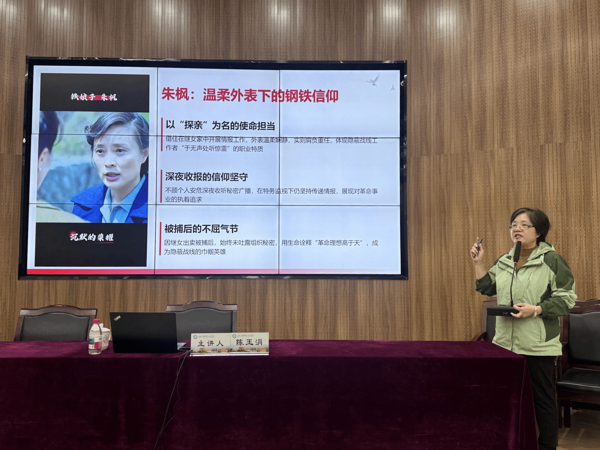 课程重点结合《沉默的荣耀》中感人至深的英雄事迹,深刻揭示了平凡与伟大的辩证关系,以及信仰力量的巨大能量。陈老师生动讲述了吴石将军所展现的果断沉稳的战略定力、舍家为国的大义担当和至死不渝的忠诚底色。陈玉涓老师口中的吴石将军是临危授命的信仰践行者;朱枫同志温柔外表下有着钢铁信仰;聂曦与陈宝仓则展现了信仰共同体的生死相依。通过对这些“隐蔽英雄”的分析,陈老师总结出深刻启示:伟大源于平凡岗位的坚守,信仰的力量在“沉默”中爆发,于无声处听惊雷。