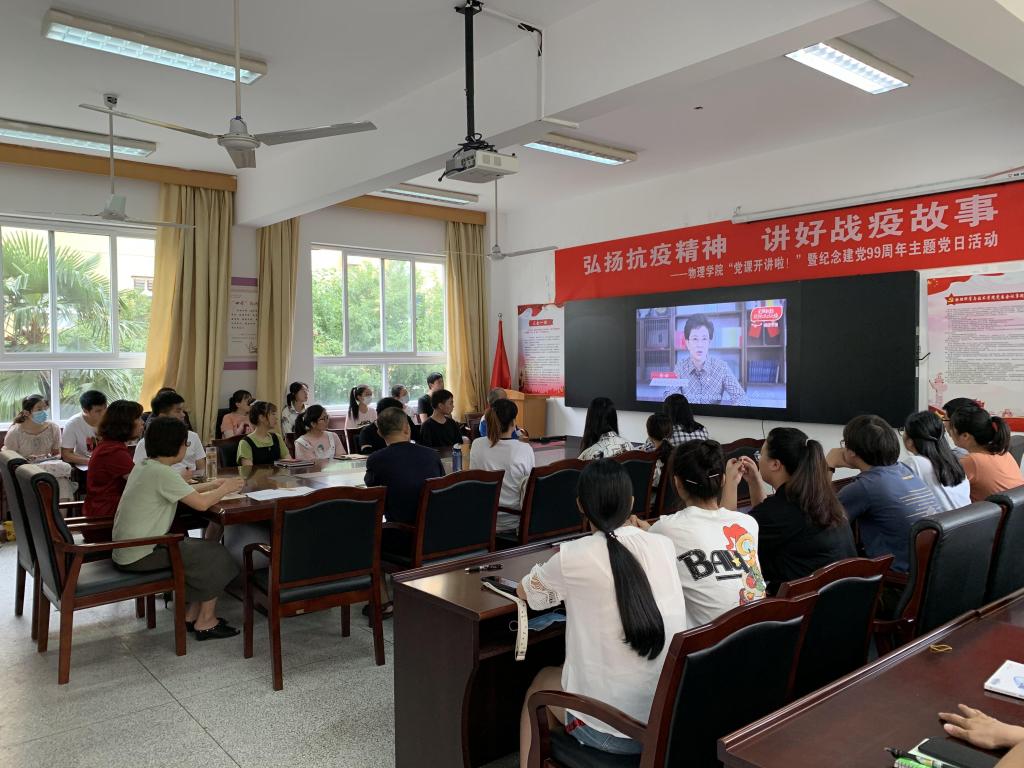 为进一步学习贯彻习近平总书记关于“让党旗在防控疫情斗争第一线高高飘扬”的重要指示精神,提升学生党员的爱国情感,深入宣传疫情防控的感人事迹和生动经验。7月1日,物理成人av 组织50余名师生党员在党员之家集中观看《高校党组织战“疫”示范微党课“七一”专场》。