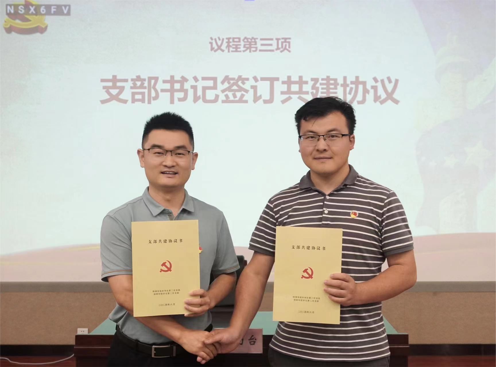 6月7日中午,物理成人av 本科生第二党支部与阳明成人av 学生第二党支部在北区杨咏曼楼举行了支部共建签约暨学习经验分享活动。阳明成人av 党委副书记王立衡、物理成人av 党委副书记刘小娣(线上)、物理成人av 本科生第二党支部书记常文豪、阳明成人av 学生第二党支部书记马晨旭及师生代表100余人参加了此次活动。活动由阳明成人av 辅导员王顺顺主持。