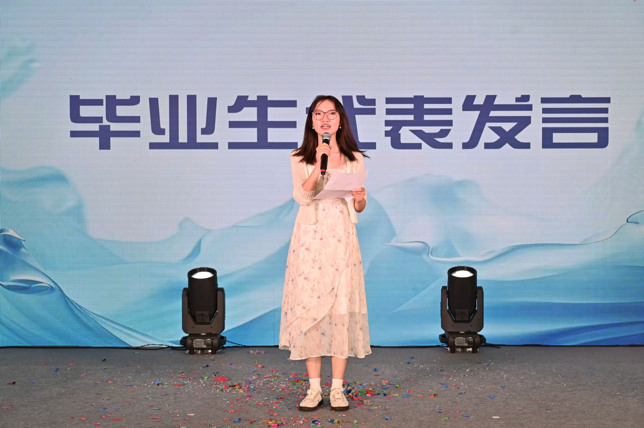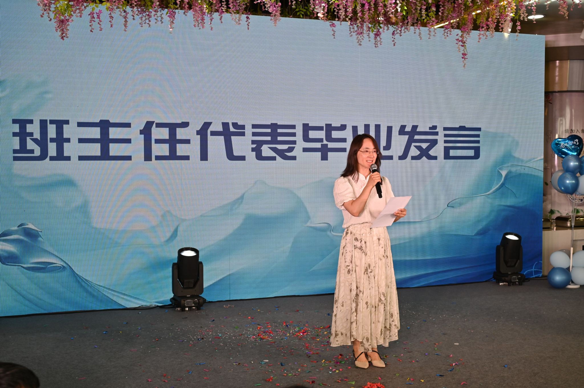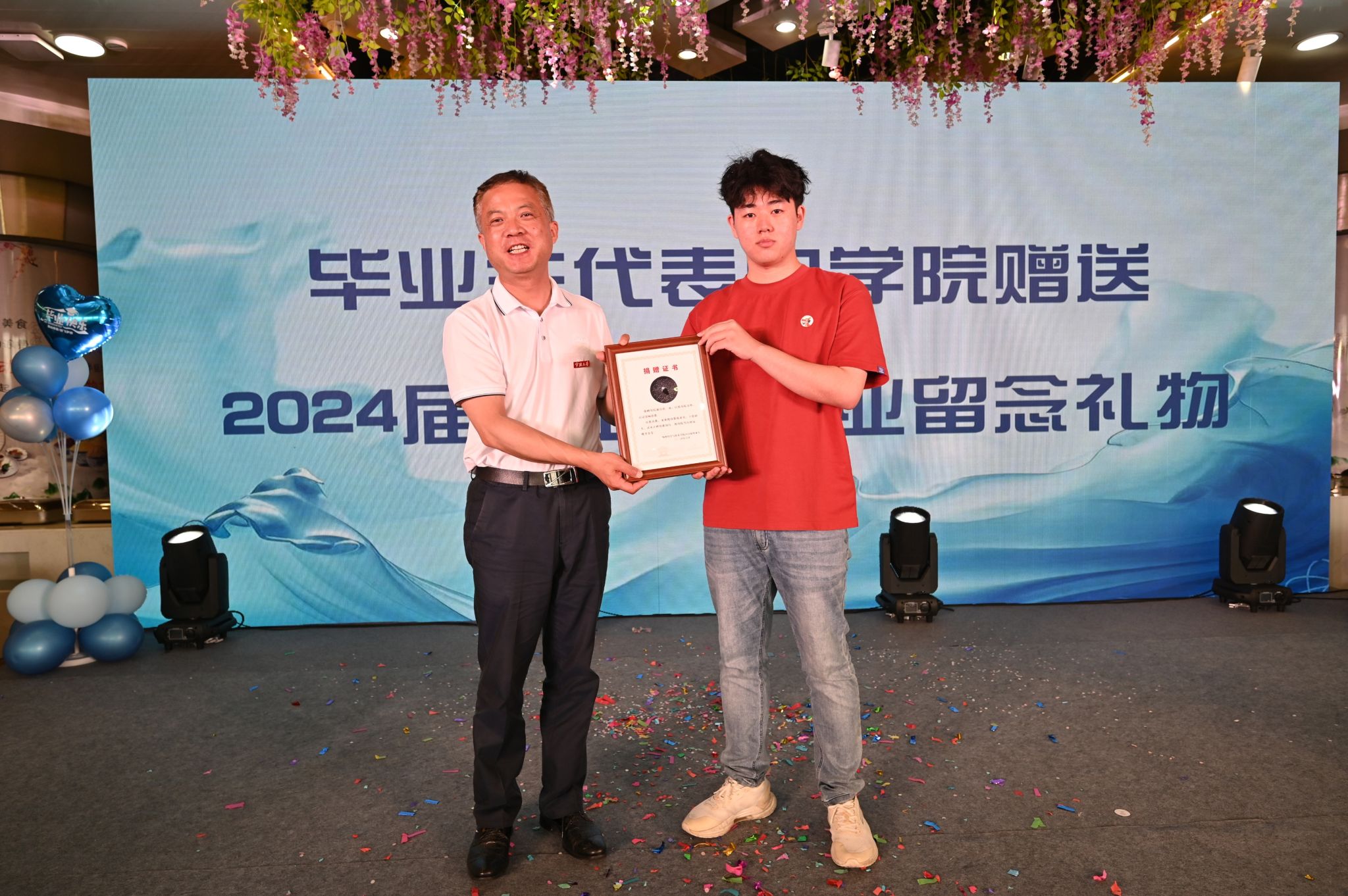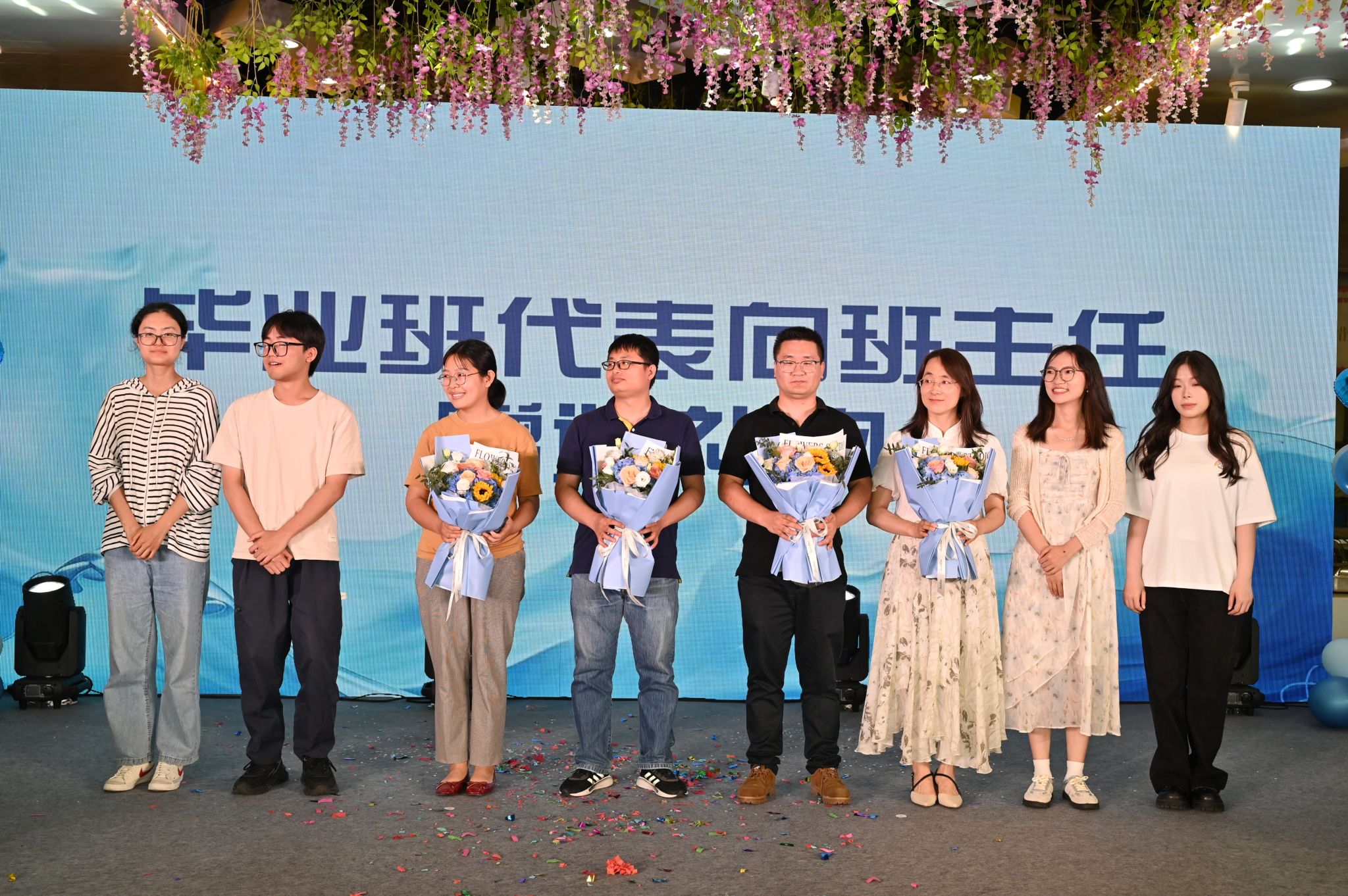 接着,毕业班班主任代表和优秀本科毕业生代表先后上台发表毕业感言。一朝沐杏雨,一朝念师恩。欢送会现场,毕业生代表还为老师们献上鲜花,花朵有尽,而感恩之情无限。