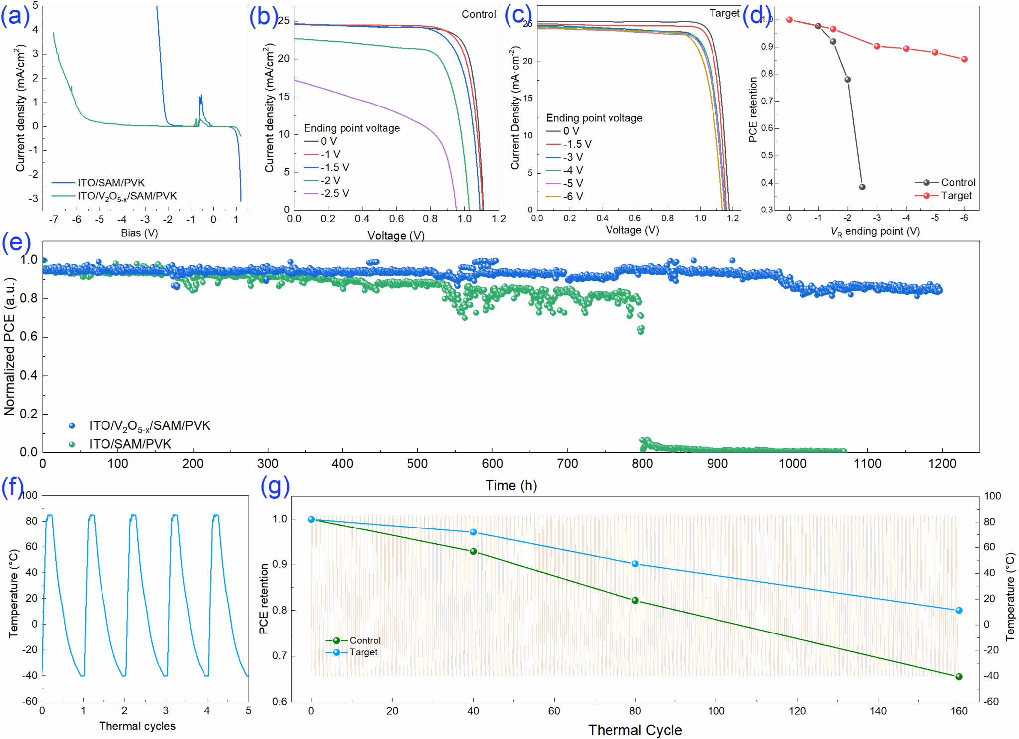 具体地,通过对V2O5薄膜的处理温度的系统改变来连续调控V2O5-x氧空位浓度、掺杂浓度、缺陷密度、功函数和介电常数等光电特性,从而在最优温度下实现25.88%的光电转换效率。相比采用SAM或者NiOx的对照组器件,该优化器件的光伏性能、反向击穿电压、反向偏压稳定性、热循环稳定性和长期模拟太阳光光照稳定性均得到了不同程度的提升。