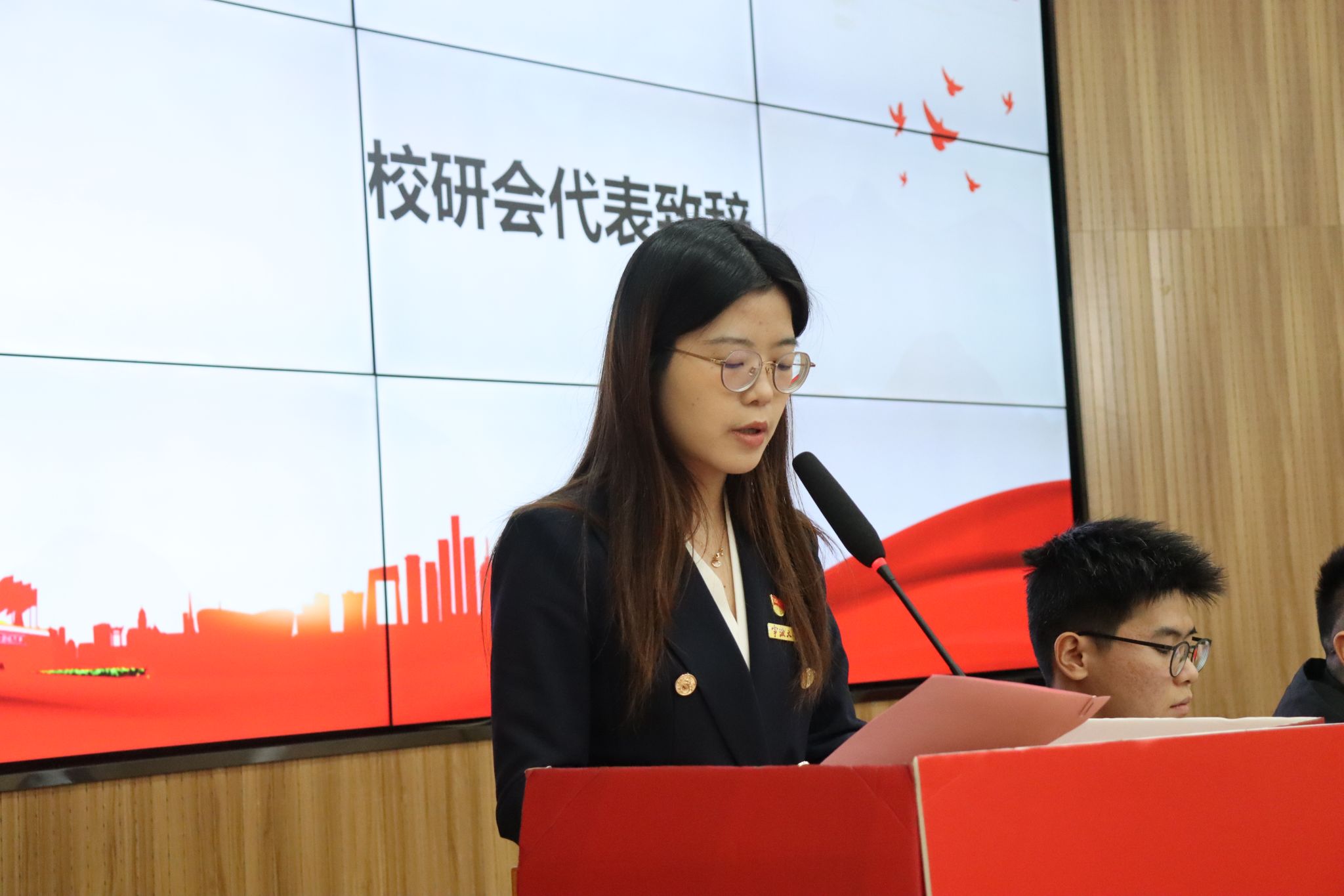 成人av 研究生会主席团成员周柠檬向本次研代会的召开表示热烈祝贺,向一直以来支持关心研究生成长、积极指导学生工作的党政领导、老师以及同学们表示感谢。同时,她也代表校研会对成人av 研究生会的工作提出几点建议:一要擎旗铸魂强引领,增强思想拉力;二要俯身倾耳听心声,凝聚服务引力;三固本培元优机制,激发组织合力。