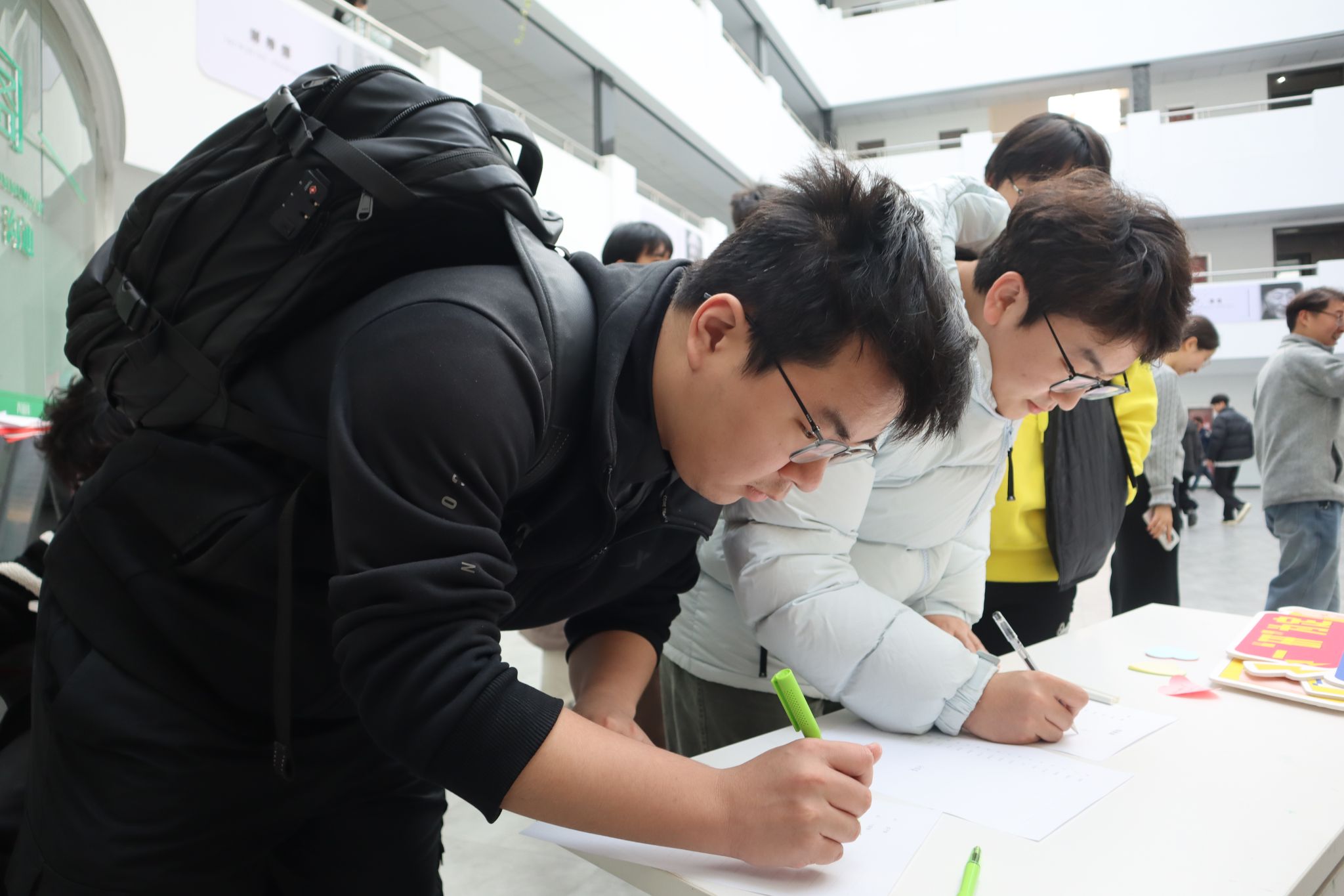 活动前夕,学院的关怀已悄然浸润每个细节。院领导与老师们为考研学子亲手书写祝福贺卡—— 一字一句凝牵挂,一笔一画寄期许;并参与“暖心加油包”的装袋整理,将文具、暖贴、零食等物资细心分装。从笔墨真情到实物传递,这份亲手准备的温暖,让关怀从心意化为行动,赋予学子们踏实前行的力量。活动当日,大厅里暖意融融。那面早早立起的“祝福墙”,早已被层层叠叠的便利贴装点成一道动人的风景。这里有学弟学妹真挚的加油,有同窗战友并肩的誓言,也有考研人为自己许下的期许。“一战成硕!”“我们顶峰相见!”……真挚的话语交织成无形的力量网络,让每位驻足其前的学子,都感受到自己并非孤军奋战。活动现场,学院精心准备的“暖心加油包”成为最实在的温暖载体。其中不仅有笔、尺、橡皮等齐全的备考工具,更有暖宝宝、能量零食、橙子等饱含心意的冬日关怀。学子们有序领取,笑意盈盈。一份份礼包,递出的是实用的支持,更是“物院始终与你同在”的深沉陪伴。