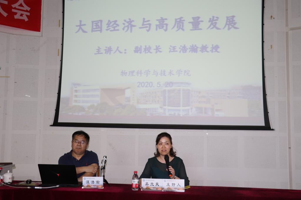 5月20日,宁大副校长汪浩瀚在龙赛报告厅为物理成人av 学生主讲题为“大国经济与高质量发展”的形势与政策课,此课也作为物理成人av 党委理论学习中心组学习扩大会学习内容,线上线下500余位师生参与听讲。