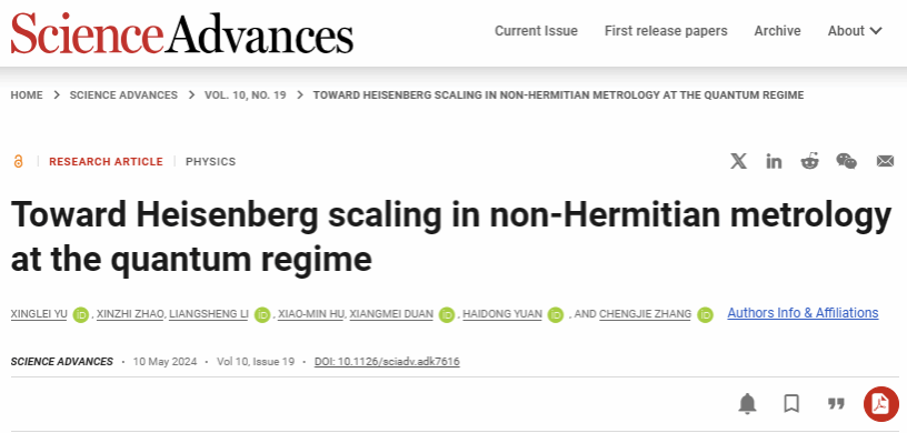 近日,成人av 张成杰教授课题组在非厄米量子精密测量研究方面取得重要进展,提出了适用于非厄米系统的量子Fisher信息和最优测量条件,并实验研究了非厄米量子参数估计问题,估计精度达到海森堡标度。相关研究工作以“Toward Heisenberg scaling in non-Hermitian metrology at the quantum regime (迈向量子领域非厄米计量学中的海森堡标度)”为题,于2024年5月10日在国际著名期刊《Science Advances》(科学进展)上发表。