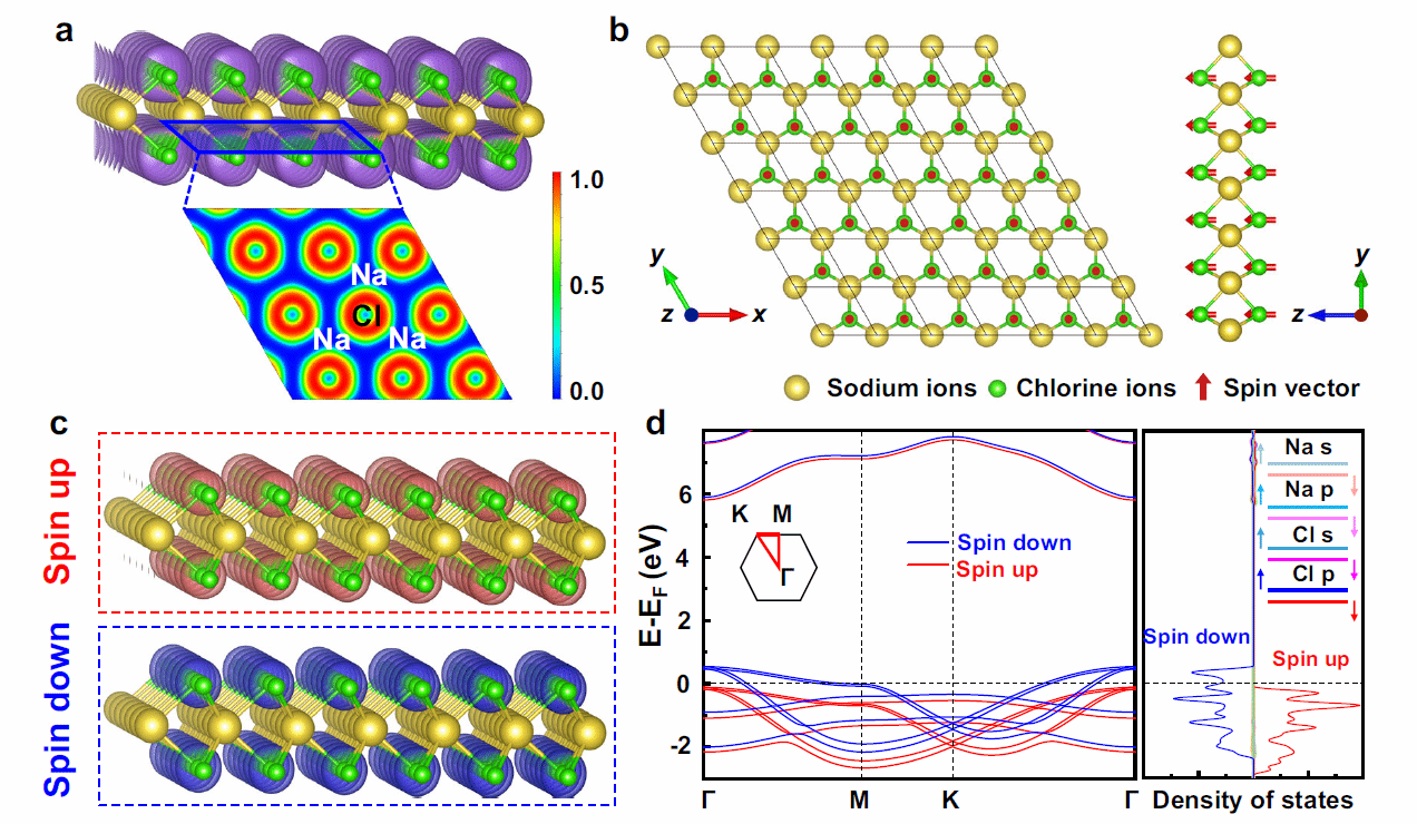 团队研究人员通过多种磁性表征技术均发现二维NaCl2晶体具有室温铁磁性,该铁磁性来源于费米级附近氯元素的p轨道电子自旋极化。理论计算进一步预言该晶体具有铁磁半金属特性。NaCl2晶体源于氯元素的室温铁磁性这一新奇发现,突破了铁磁性需含有未成对d或f电子的过渡金属元素的传统理解和元素范畴,表明铁磁性可以在更广泛的元素和化合物中出现,为开发新型磁性材料和技术提供了新的途径。