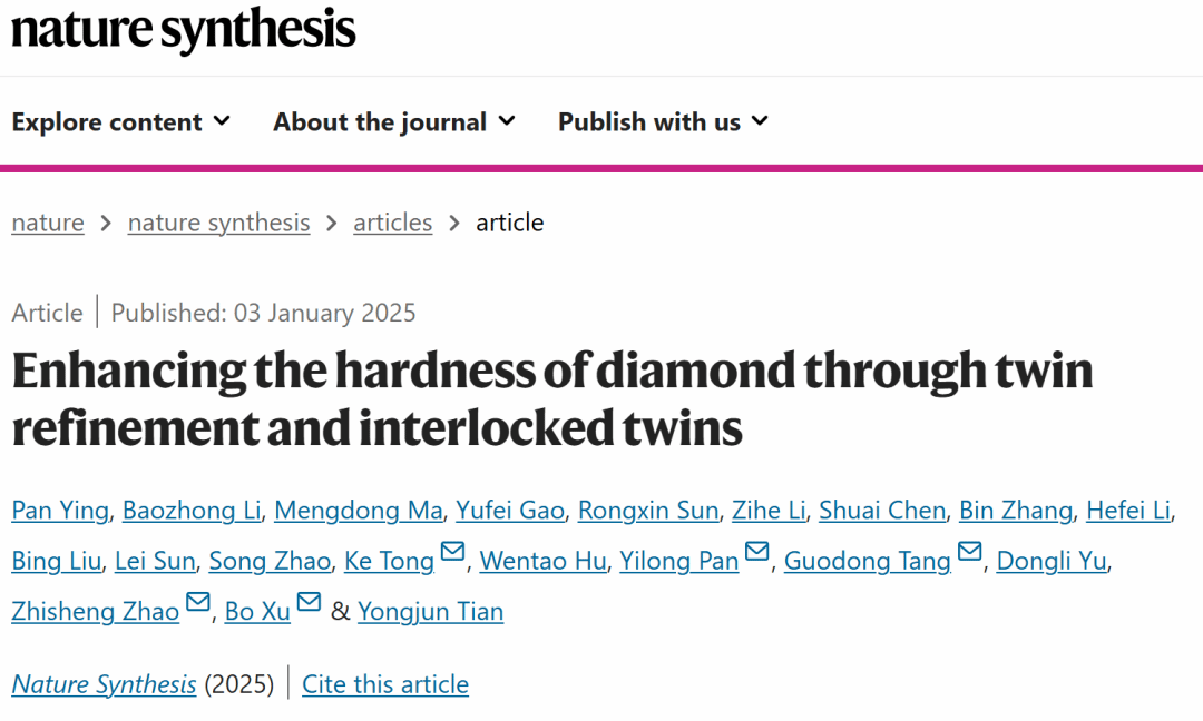 近日,成人av潘益龙研究员联合燕山大学高压科学中心田永君院士团队及南京理工大学研究人员在超硬材料领域实现重大突破:成功合成出硬度达276 GPa的超细纳米孪晶金刚石块材,继合成具有突破性硬度各向异性的金刚石块材后(发表于PNAS,原文链接://doi.org/10.1073/pnas.2108340118),再次刷新了材料硬度的世界纪录。相关研究以“Enhancing the hardness of diamond through twin refinement and interlocked twins” 为题。于2025年1月3日在《Nature Synthesis》在线发表(原文链接://doi.org/10.1038/s44160-024-00707-1)。