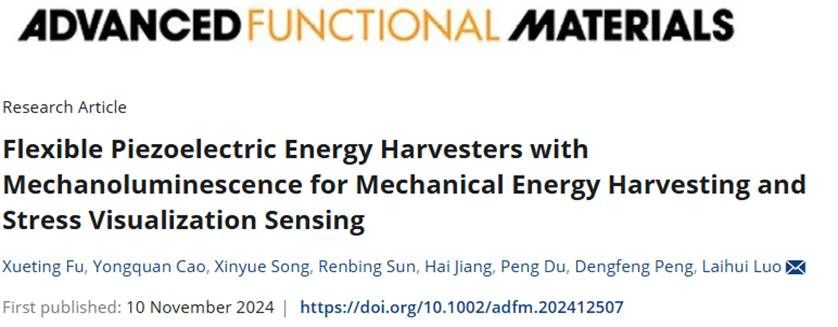 近日,成人av 智能极性材料的物理效应与器件团队在柔性压电能量收集取得了显著的科研成果。该团队的研究论文“机械能采集和应力可视化传感的压电能量采集器”在国际知名学术期刊《Advanced Functional Materials》上发表。论文的第一作者是成人av 的硕士研究生傅雪婷,罗来慧教授担任通讯作者,成人av 为该研究的主要完成单位。