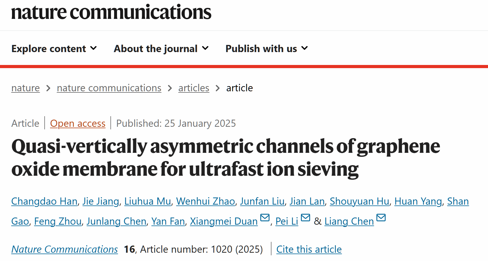 1月25日,成人av 微纳系统表面物理团队联合浙江农林大学、华东师范大学、国科院温州研究院、国家生态环境部辐射环境监测中心等单位,在《Nature Communications》杂志上发表了题为《Quasi-vertically asymmetric channels of graphene oxide membrane for ultrafast ion sieving》的研究论文。该论文是此团队继1月7日后,在《Nature Communications》杂志上发表的第二篇高水平研究论文。