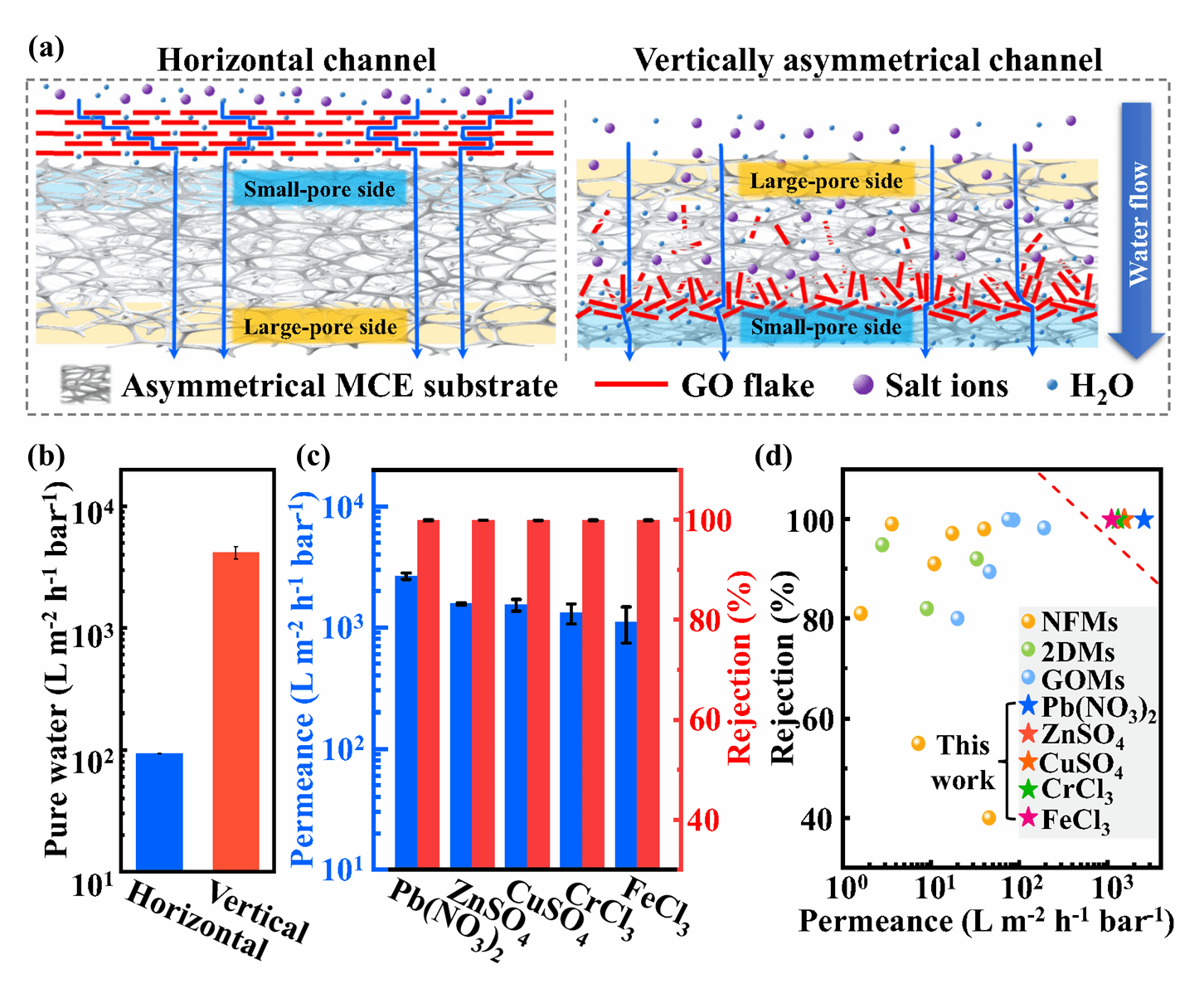 分子动力学计算和第一性原理分析发现,该新型膜优异的水渗透性能得益于其独特的垂直通道结构。这类通道的水传输路径极短,具有较低的水分子渗透势垒,且整张膜具有超高的通道密度,有利于水分子高效快速通过。该工作首次采用具有不对称孔隙的衬底作为自组装模板,强化了氧化石墨烯纳米片的自组装效果,使该膜具备出色的截留效率和机械稳定性,特别是有效抑制了溶胀现象。