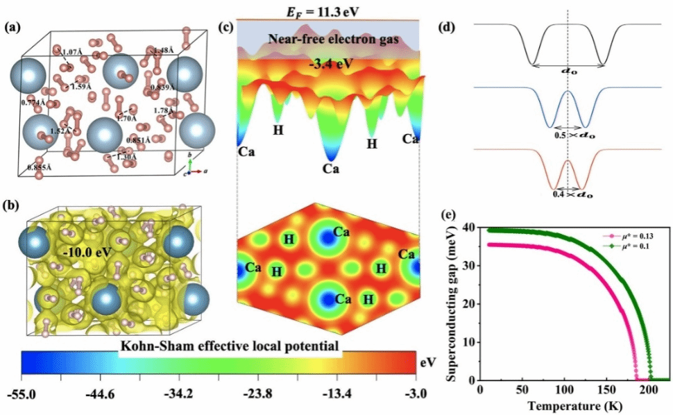 在本研究中,课题组针对分子氢不利于高温超导的传统观点提出挑战。基于第一性原理计算,成功设计出压致H2分子型氢化物CaH14,并预测其在高压下具有204 K的高温超导转变温度。研究发现,其独特的电子结构特征在于费米面处显著出现近自由电子气,但H2分子结构保持完整并未发生解离。这一发现表明超导转变的必要条件是形成库伯对的自由电子气作为费米海,而非原子氢。研究团队在Kohn-Sham密度泛函理论框架下揭示出该分子氢化物有效势并阐明近自由电子气的产生机理。如图所示,(i)随着压力的施加,H2单元和Ca离子形成的有效势阱彼此移动,形成较低的有效势脊连接。(ii)由于强烈的泡利排斥效应,电子占据更高能级,其典型特征是高费米能级的形成。因此,由压力引起的电子动能的增加超过了Ca和H2阳离子所形成的有效势阱的束缚,从而使电子从势阱中逸出,形成了类似于凝胶背景电荷上的自由电子气。