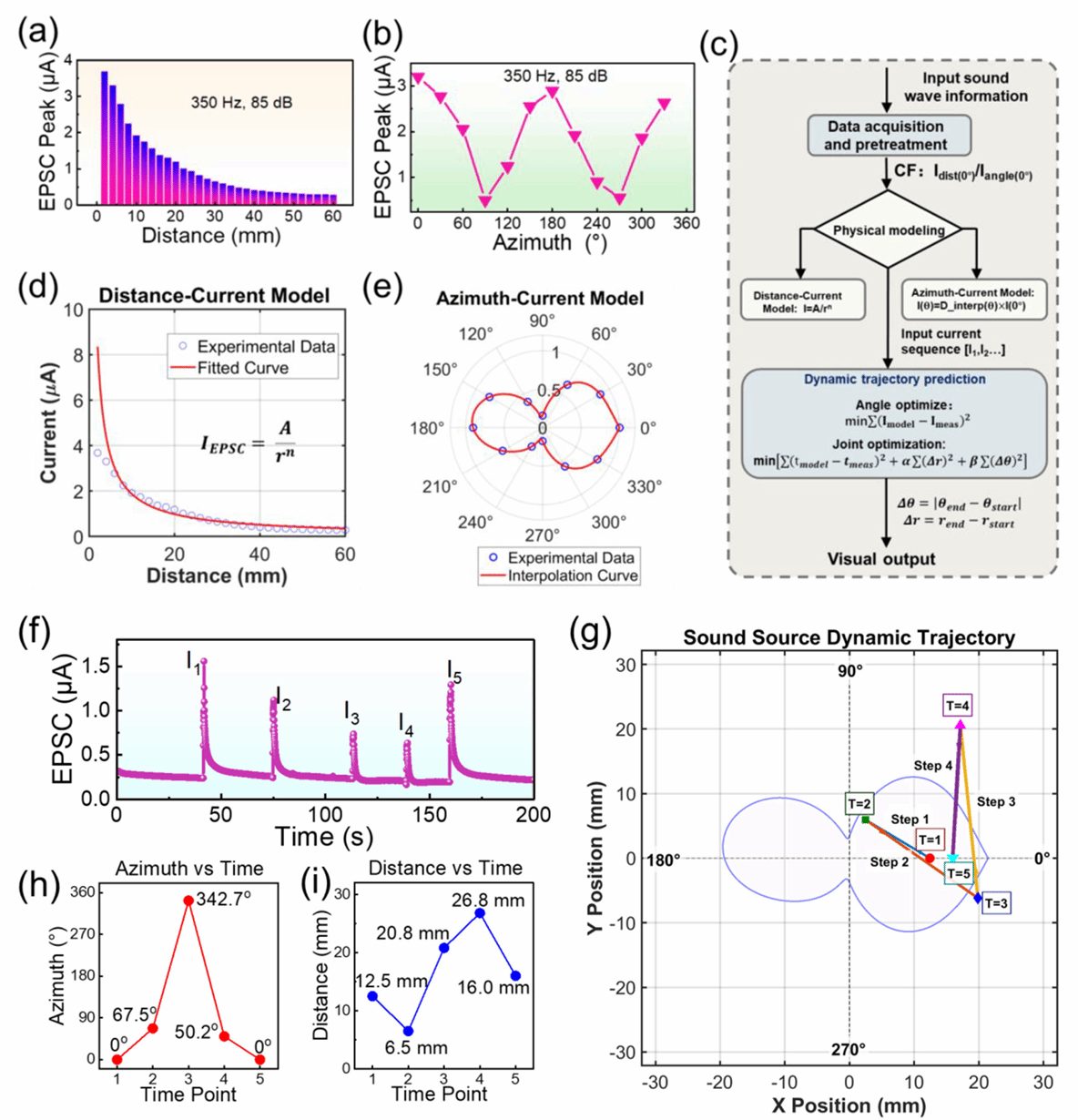 摩擦纳米发电机(TENG)可以将环境机械能转化为电信号,具备自供电能力。课题组在前期研究中通过选取特定的材料和结构,摩擦纳米发电机可感知各种声波信号,在此基础上构建了具有自主信号处理能力的听觉感知系统,实现了对声波信息的加密与解密功能。由于声频敏感摩擦纳米发电机(SFS-TENG)的声波频率敏感特性,器件对不同速率的声源具有不同的响应,从而实现了对多普勒效应的演示,并展示了其在智能交通中的应用前景。相关工作发表于Nano Research 2025, 18, 94907378 (第一作者周思远,通讯作者竺立强)。在本研究中,课题组进一步提出了供电仿生听觉-触觉双模态感知平台(SBAT-BPP),集成了摩擦纳米发电机(TENG)和壳聚糖栅控的氧化物神经形态晶体管,能够高效感知听觉和触觉双模态信号。TENG具备复杂的跨模态神经形态实时感知能力,可将声音和压力信号转换为电信号,其对声音信号表现出60-10000 Hz的宽检测范围和~1.65 V/dB的高灵敏度,而对压力信号具有63 mV/N灵敏度,相比传统单模态传感器更具优势,为多感官智能感知提供了关键技术支持。将TENG的传感和能量收集功能与ITO神经形态晶体管的记忆和学习功能相结合,可在感知平台中实现低功耗智能传感。此外,得益于SBAT-BPP系统出色的距离传感和方位角传感能力,基于声压传播定律构建了距离-电流模型,通过样条插值法得到的方向性函数构建了方位角-电流模型,基于此进一步集成构建了声源定位统一模型并融合运动正则化约束算法,实现了动态声源的高鲁棒定位。SBAT-BPP凭借其自供电特性、简单架构和多模态感知能力,在听力健康监测、动态声源轨迹识别和触觉人机交互等领域展现出了广阔的应用前景。该策略通过单一感知系统实现了听觉和触觉的双重感知,为人机交互和便携式人工智能系统的发展提供了借鉴。