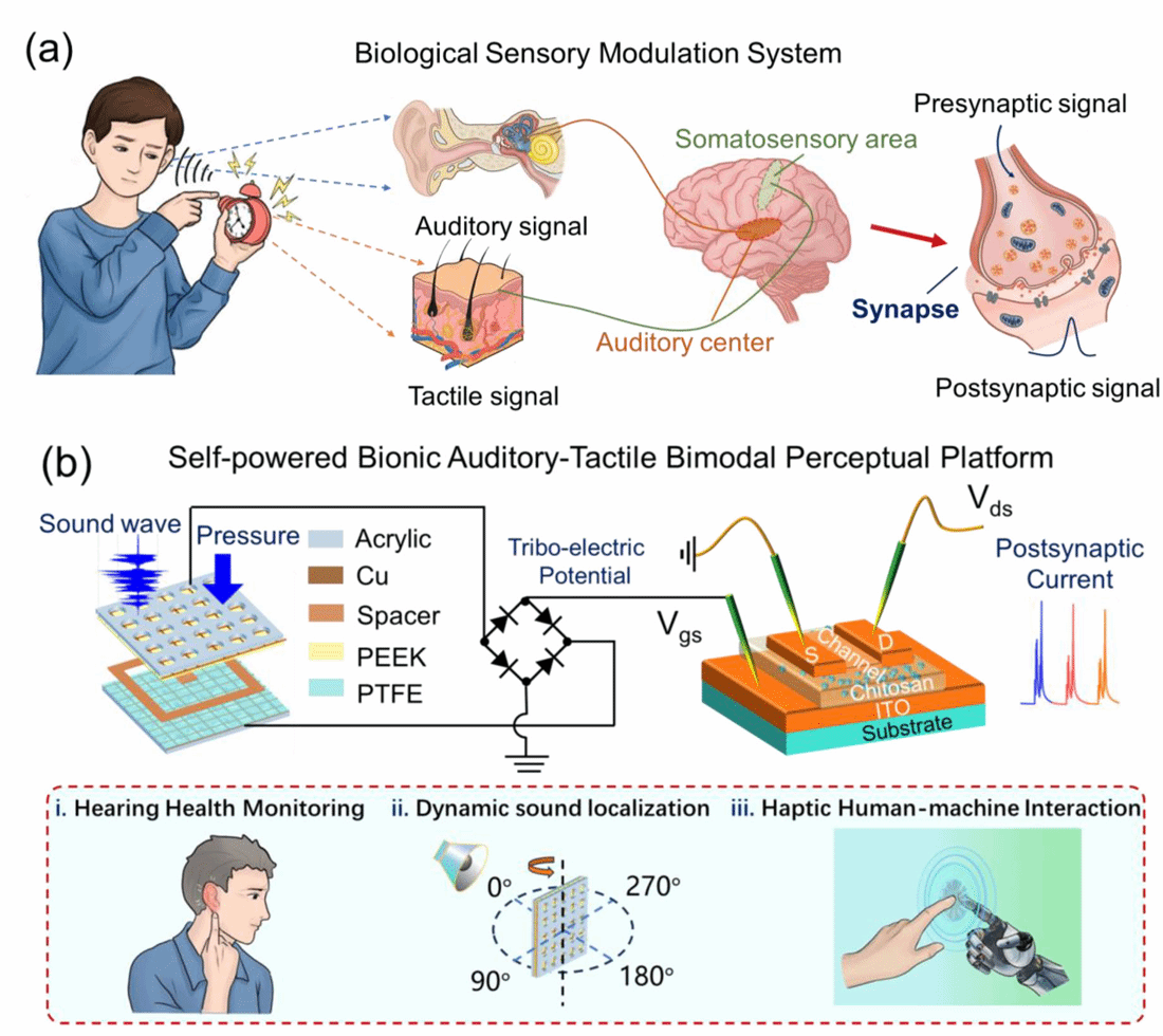 近日,成人av 竺立强教授课题组在自供电多模态智能感知系统方面取得重要进展,研究成果以“自供电仿生听觉触觉双模感知平台,基于摩擦起电驱动离子传输型神经形态晶体管”为题发表于国际知名学术期刊《Advanced Functional Materials》上。论文第一作者是成人av 博士研究生王伟胜,通讯作者是竺立强教授。