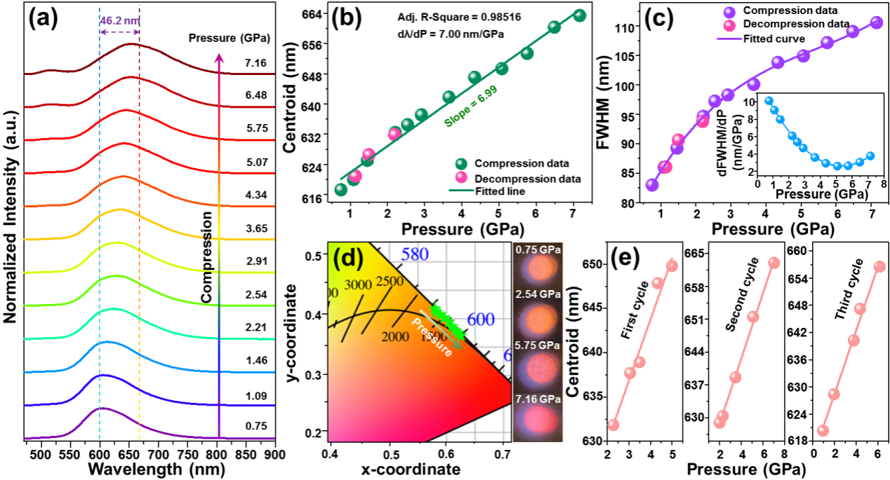 近年来,稀土/过渡金属掺杂发光材料由于其独特的光学特性而被广泛应用于白光LED、光学温度传感、光催化、压力检测等领域。其中,荧光检测因其具有分辨率高、非接触、相应速度快等优势,而被大量研究。近年来,荧光压力传感因其具有非接触、响应速度快、高分辨等优势而被广泛研究,其中红宝石(Al2O3:Cr3+)作为商业化产品而备受青睐。然而,红宝石具有灵敏度低(dλ/dP = 0.365 nm/GPa)、高压荧光猝灭等缺陷,限制其进一步的使用推广。针对上述问题,成人av 陶瓷发光实验室以Mn2+掺杂NaY9(SiO4)6O2红色荧光粉为研究对象,获得了具有高效率的压敏发光材料。