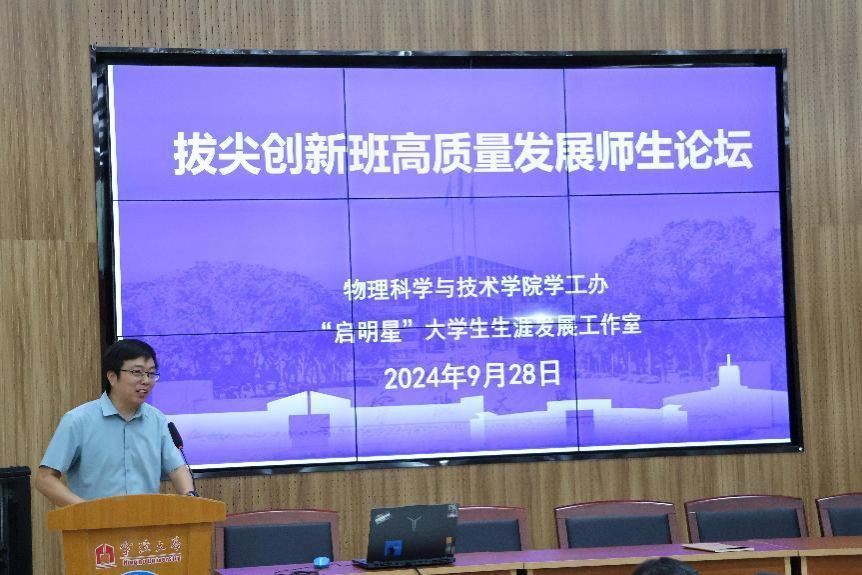 9月28日下午,成人av 拔尖创新班高质量发展师生论坛在龙赛理科楼报告厅举行,物理系主任汤世伟、学工办主任常文豪、拔尖创新班班主任黄艳萍、贾曼老师参加大会,参加大会的还有成人av 全体拔尖创新班成员。