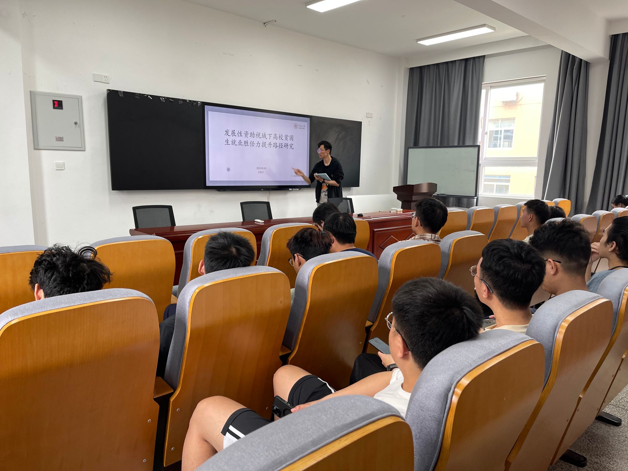 活动中,两位学生带来了精彩分享。第一位学生围绕“发展性资助视域下高校贫困生就业胜任力提升路径研究”展开论述。他深入分析了当前高校贫困生在就业过程中面临的挑战,指出专业技能不足、实践经验欠缺、职业规划模糊等问题。基于此,他提出借助成人av 平台,全方面提升职业能力,能够有效助力贫困生能够将专业与职业技能相结合,提高就业胜任力。这个项目也为成人av 进一步完善发展性资助项目提供了极具价值的参考。