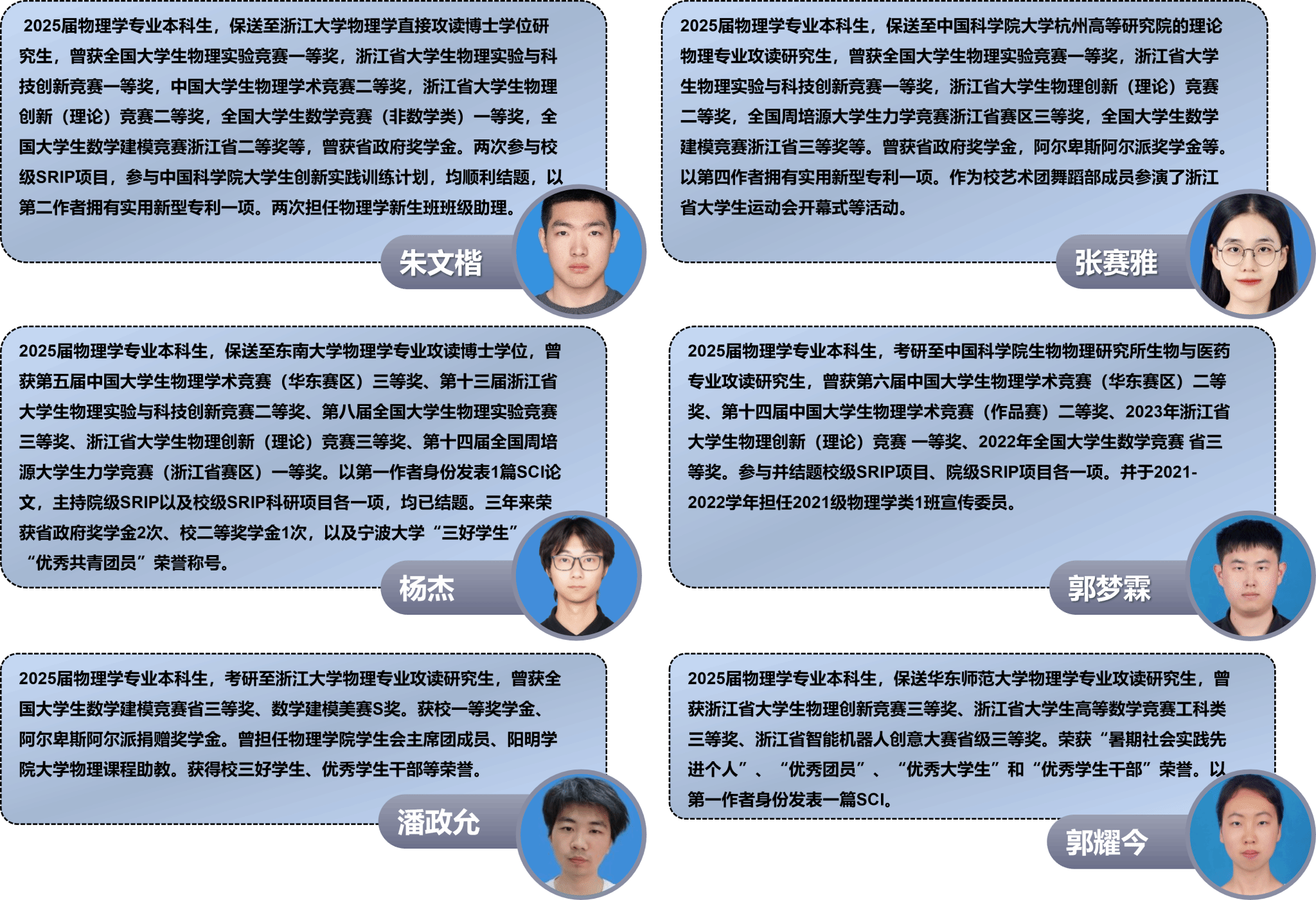 ➢ 物理学专业近年来平均升学率达到50%(其中2022届研究生录取率超过75%)。每年都有多位同学进入复旦大学、浙江大学、南京大学等知名科研院所深造。