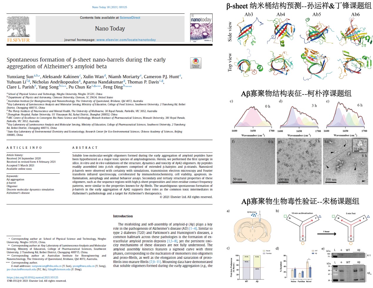 生态环境研究中心宋扬研究员(通讯作者)课题组联合在《Nano Today》(影响因子16.907)杂志发表题为“Spontaneous formation of β-sheet nano-barrels during the early aggregation...