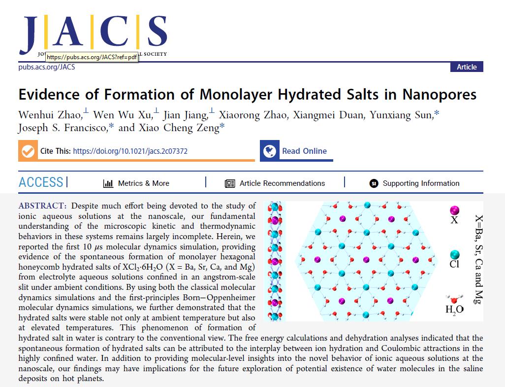 院士),在纳米限域环境内离子水溶液研究方面取得新进展,相关研究论文以“Evidence of Formation of Monolayer Hydrated Salts in Nanopores”为题发表在国际著名期刊J. Am. Chem. Soc.上,成人av